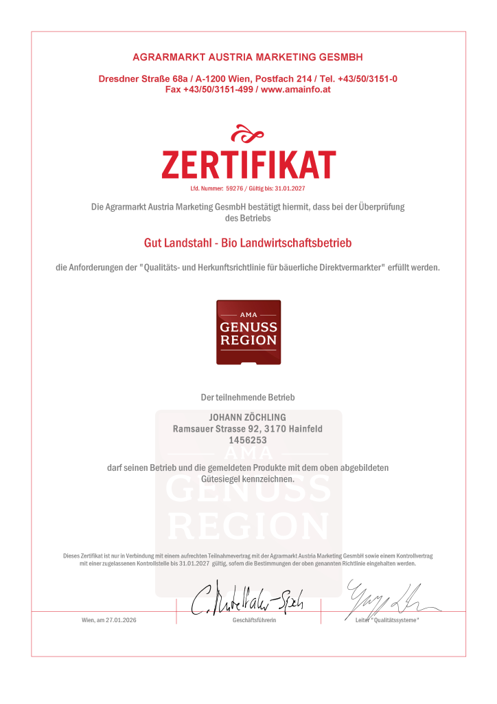 Wir führen unseren Bauernhof streng nach biologischen Richtlinien und sind als Bio-Betrieb zertifiziert, des Weiteren sind wir Teil der „AMA Genussregion“ und „AMA Genussregion Bauernhof“ Qualitäts- und Herkunftssicherung für bäuerliche Direktvermarkter.
